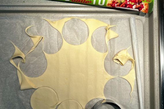 Con un coppapasta (io ho usato quello da 8 cm ma puoi usare anche quello da 10 cm per avere cestini più alti) ricaviamo dei cerchi su tutta la superficie della sfoglia.
