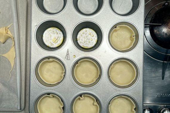 Foriamo la base con i rebbi di una forchetta. Inforniamo in forno caldo per 15/20 minuti a 200°C. Possiamo mettere dei ceci secchi all’interno di ciascun cestino per evitare che in cottura la sfoglia si gonfi troppo. In alternativa, durante la cottura, con una forchetta foriamo ancora la parte che si sta alzando.