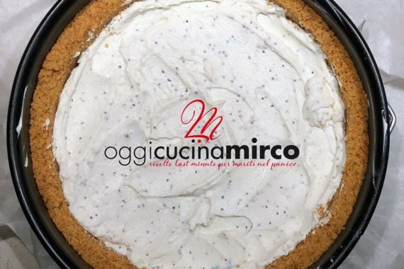 Dopo il tempo di refrigerazione tiriamo fuori la base dal frigo (lasciamola nello stampo) e cominciamo a comporre la cheesecake: stendiamo lo strato di crema di robiola e appianiamolo con una spatola.