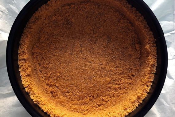 Foderiamo la base del nostro stampo a cerniera con carta forno e versiamo all'interno il composto per la base. Con l'aiuto di un cucchiaio o con il fondo di un bicchiere compattiamo il fondo pressandolo bene. Volendo possiamo creare un cordone laterale, abbastanza spesso e compresso per evitare si sfaldi. Se non volete avere problemi, lasciate solo il composto sul fondo. Mettiamo in frigo per compattare, circa 2 o 3 ore.