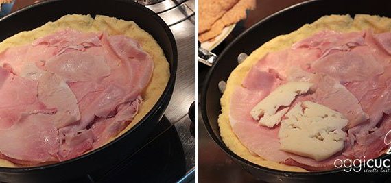 ungiamo una padella del diametro di 20/22cm con l'olio, prendiamo metà impasto e distribuiamolo sulla superficie della padella a mò di focaccia;