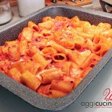 In una teglia (io ho usato la LASAGNERA GUARDINI versiamo la pasta avanzata e la condiamo con besciamella (se vogliamo usarla)e qualche cucchiaio di passata di pomodoro MUTTI;