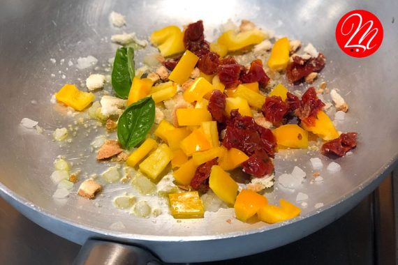 Tagliamo i pomodori secchi a listarelle il peperone giallo a cubetti.