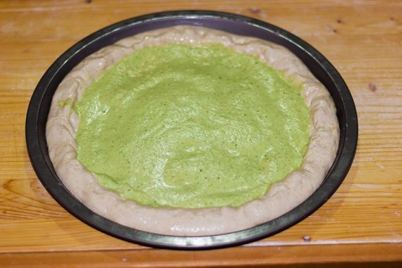 Versiamo il pesto di zucchine a centro pizza, come fosse passata di pomodoro e stendiamolo uniformemente.