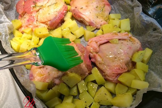 Prendiamo ora la nostra salsa e, con un pennello da cucina, cominciamo a spennellare per bene le sovracosce e, perché no, se vi avanza della salsa, anche le patate.