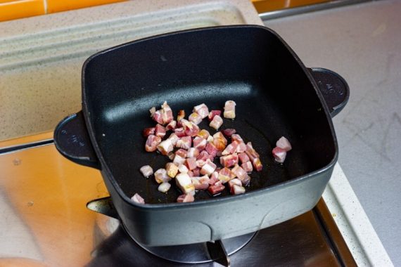 Nella stessa padella mettiamo la pancetta a dadini con un filo d’olio e facciamo rosolare. Teniamo da parte.