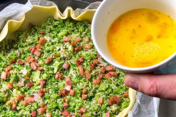 Tiriamo fuori dal frigo il rotolo di pasta brisée e stendiamolo all’interno di una teglia tenendo la carta sotto. Buchiamo con i rebbi di una forchetta la base, distribuiamo il condimento tritato al mixer su tutta la superficie.