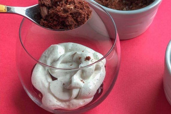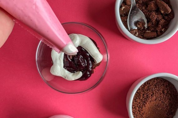 Ripetere gli strati chiudendo con la crema. Coprire con la polvere di pan di stelle come se fosse la terra di una piantina e decorare con foglie di menta e il frutto scelto.